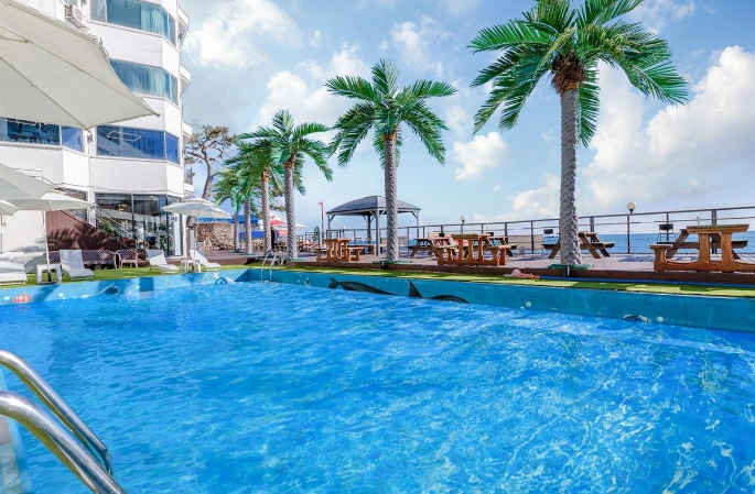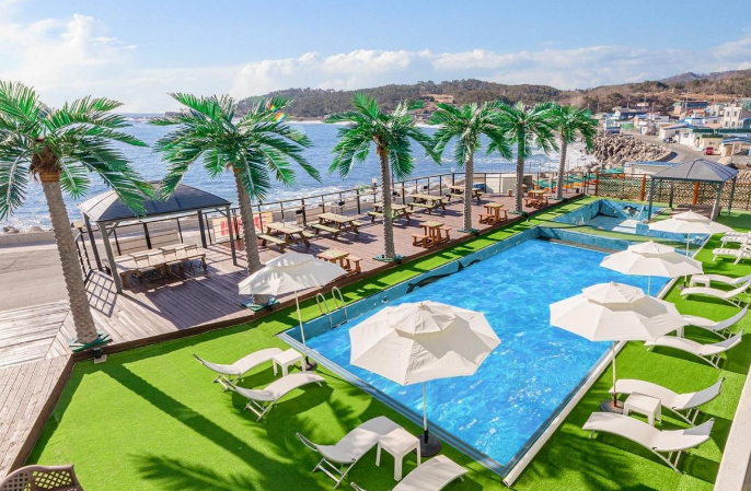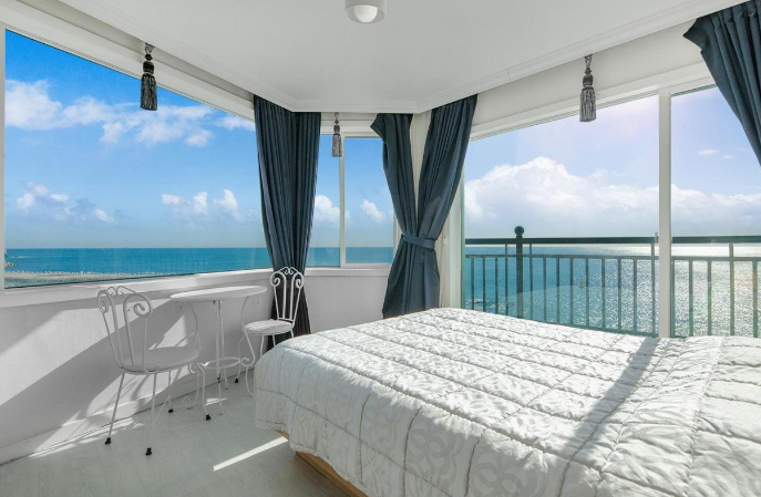 - 수영장과 오션뷰 메리트가 있다. 바로 앞에 바다 산책로가 있고 투썸도 있다. 사장님이 친절하시다. / 룸 상태의 오래된 느낌은 감안해야 한다. 특히 침대 상태가 스프링이 많이 꺼져 있어서 몸살 날 뻔 했다. 4호라인은 끝방이라 거의 하프 공간이다. 창에 습기가 맺혀 바다 절반은 보이지 않고 바베큐 공간이 협소하다.